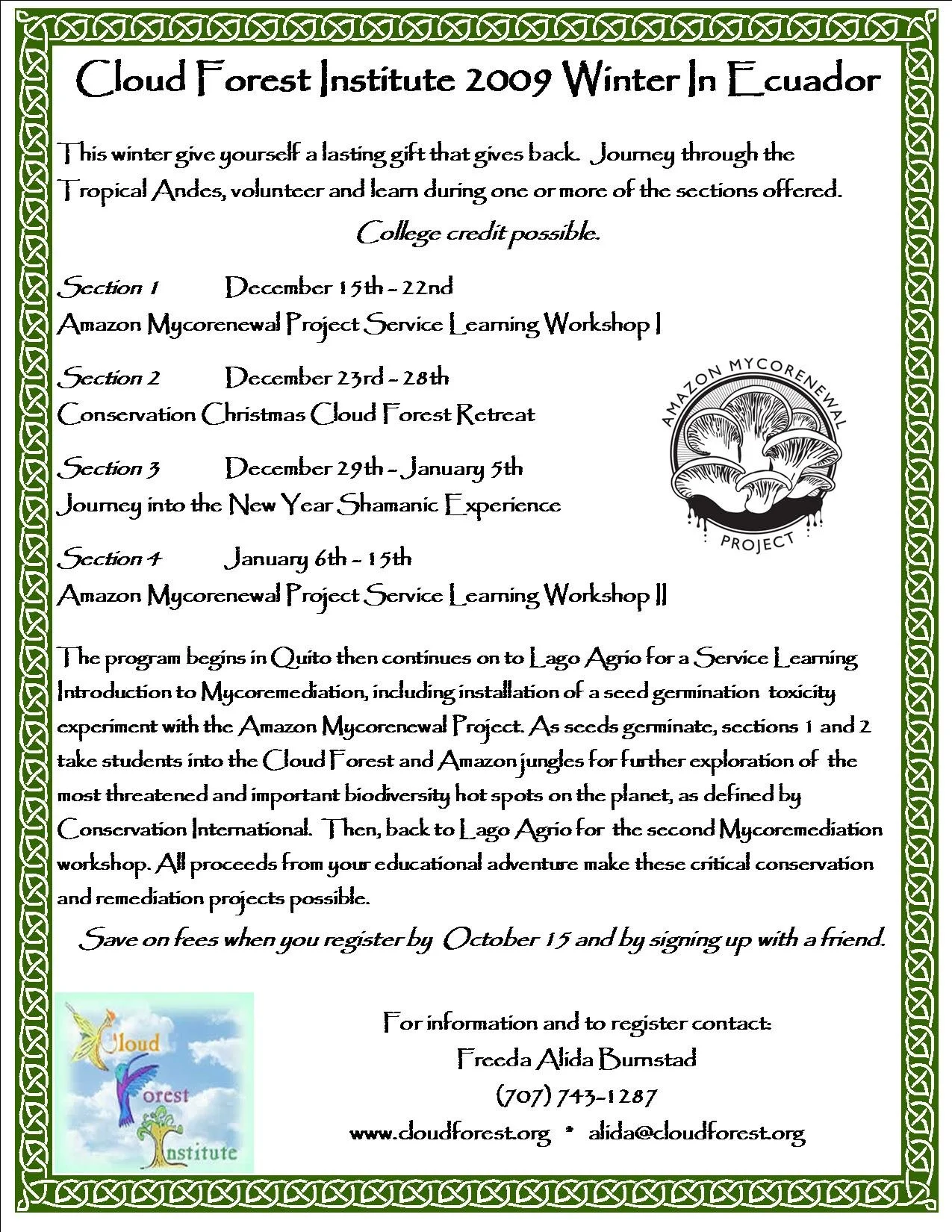 In 2006, CFI co-founded the Amazon Mycorenewal Project (now CoRenewal), helping pioneer community-based mycoremediation techniques using oyster mushrooms to address oil pollution in the Amazon Basin.